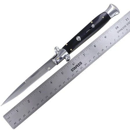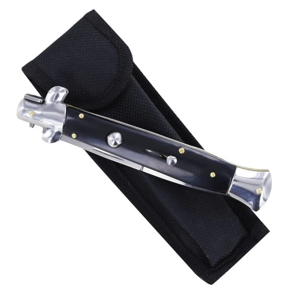 10.5 Inch Classic Black Stiletto Automatic Knife Stainless Bayo. constructed with a pure brass frame with durable ABS mounts that feature a sleek faux carbon fiber overlay. Use the large silver button to eject the blade out from the side of the handle. To retract the blade, press your thumb on the silver t-shaped bolster and manually push the blade back into the handle. safety lock located below the firing button. Included is a black nylon belt sheath. Overall Length: 10.5 inches, Blade Length: 4.75 inches