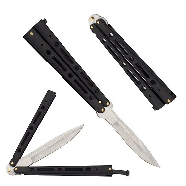 10″ Black Heavy Duty Butterfly Knife. 4.5 inch blade all metal construction with brass pins. 440 stainless steel with weight of 5.4 ounces