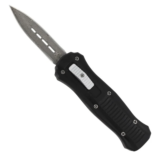 5.5″ Mini OTF Black Automatic Knife Damascus Dagger. this knife is dual action, meaning that the blade will eject and retract with the push of a single button. The blade is made from Damascus steel. A matte black Cerakote finish is given to the textured zinc aluminum handle to prevent buffs and scratches. Included with your purchase is a FREE black nylon carrying case complete with a quick release opening and belt loop. Overall Length: 5.5 inches, Blade Length: 2.125 inches