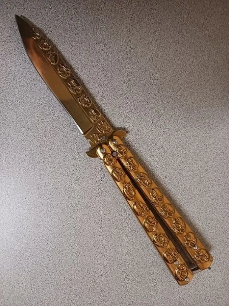 5″ Stainless Steel Butterfly Knife Gold Skulls bf-102-4. Blade Material 440 Stainless Steel Blade Type Drop Point Folding Action Butterfly Handle Construction Stainless Steel Features Locking Safety Clip Blade Length 5″ Handle Length 4.25″ Overall Length 9.25″