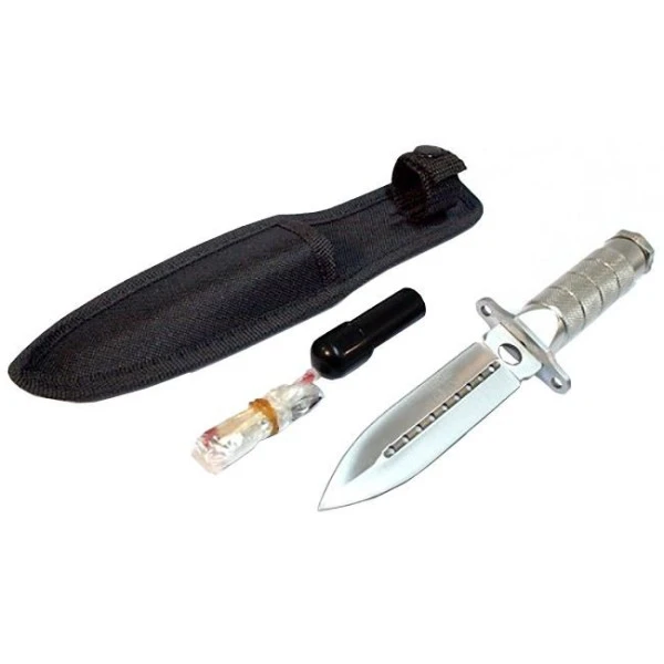 8″ Silver Full Tang Survival Knife Dagger. Overall length of the Knife is 8″ Silver Blade length of the knife is 4.5″ Handle Length: 3.5″ Silver Blade Metal Handle With Fire Starter & Compass Survival Knife With Sheath Brand New Good Quality