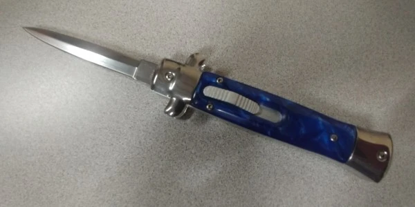 9 Inch Blue Pearl D/A OTF Stiletto Automatic Knife Satin Dagger. Out the front stiletto with strong double action in and out with the push of a button. Heavy construction weighing in at 6.5 ounces. 440 stainless steel 3.50 inch blade 5.25″ handle. Comes with belt sheath.