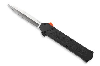AKC F-16 Black Grip OTF Automatic Knife Orange Button Satin Bayo. Overall Length: 20cm – 8″ Blade Length: 8.5cm – 3.35″ Blade thickness: 3mm – 0.12″ Weight: 90g – 3.1oz.Blade Material: 440A Stainless Steel Handle Material: Aluminium Inlay Material: Sandpaper