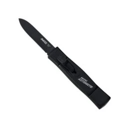 AKC F-16 Camo Grip OTF Automatic Knife Satin Dagger. Overall Length: 20cm – 8″ Blade Length: 8.5cm – 3.35″ Blade thickness: 3mm – 0.12″ Weight: 90g – 3.1oz.Blade Material: 440A Stainless Steel Handle Material: Aluminium Inlay Material: Sandpaper