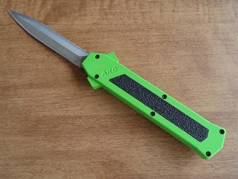 AKC F-16 Neon Green Grip OTF Automatic Knife Satin Dagger. Overall Length: 20cm – 8″ Blade Length: 8.5cm – 3.35″ Blade thickness: 3mm – 0.12″ Weight: 88 g – 3.10 oz. Blade Material: 440A Stainless steel Handle Material: Aluminium Neon Green Inlay Material: Grip black
