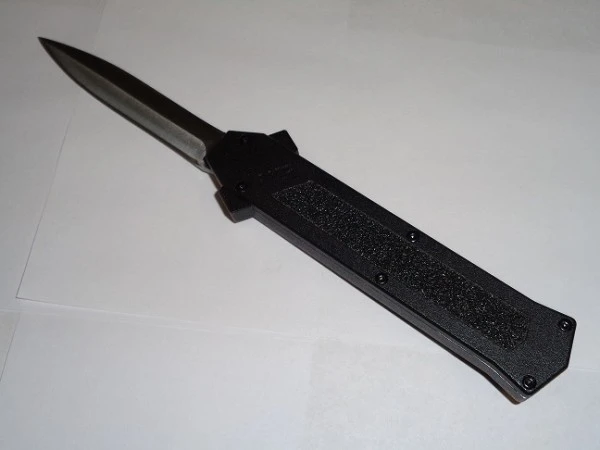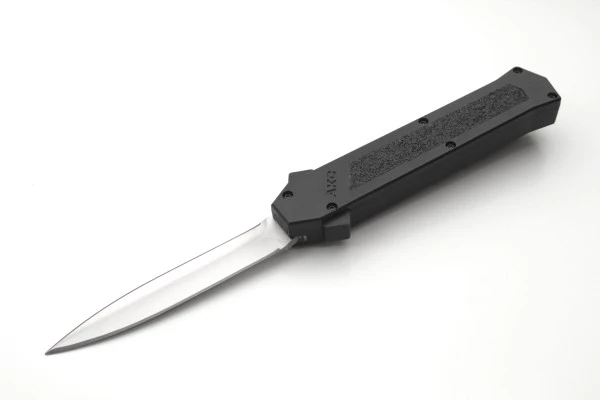 AKC F16 Black Grip OTF Automatic Knife Silver Dagger. Strong and solid mechanism with it’s double springs inside for a durable and faster opening. Blade play is almost zero minimum. Press the button forward and the blade rockets out. Pull the firing button back and the blade retracts safely. The action is fast and the knife is light and ergonomic. Satin razor sharp dagger blade, black pocket clip. Overall Length: 20cm – 8″ Blade Length: 8.5cm – 3.35″ Blade thickness: 3mm – 0.12″ Weight: 88 g – 3.10 oz. Blade Material: 440A Stainless steel Handle Material: Aluminium Inlay