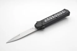 Strong and solid mechanism with it’s double springs inside for a durable and faster opening. Blade play is almost zero minimum. Press the button forward and the blade rockets out. Pull the firing button back and the blade retracts safely. The action is fast and the knife is light and ergonomic. Satin razor sharp bayonet blade, black pocket clip. Overall Length: 20cm – 8″ Blade Length: 8.5cm – 3.35″ Blade thickness: 3mm – 0.12″ Weight: 88 g – 3.10 oz. Blade Material: 440A Stainless steel Handle Material: Aluminium Inlay Material: Skulls