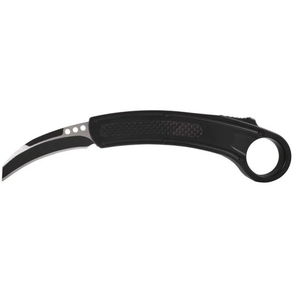 Bastard OTF (out the front) Karambit Knife – Black Carbon Fiber. When you push the button forward the curved blade shoots out! carbon fiber grip Overall Length: 8.125 inches, Blade Length: 2.375 inches.