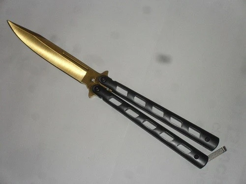 Black Balisong Butterfly Knife Gold. 9″ total length and 4 inch 440 stainless steel blade. All metal handle!