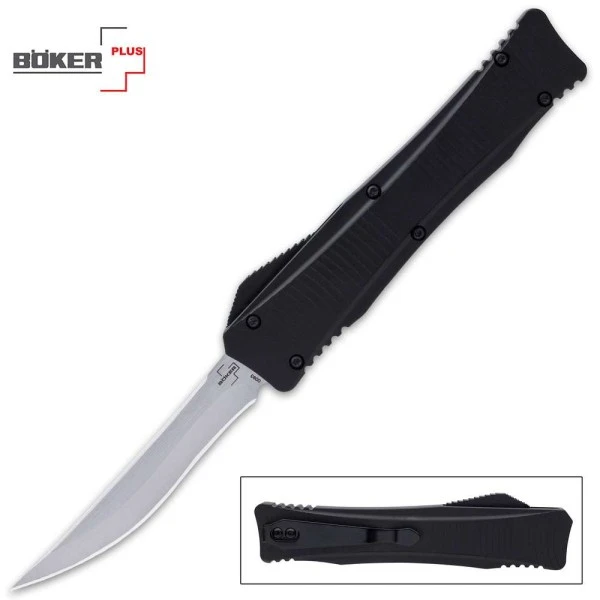 Boker Plus Eagle D/A OTF Automatic Knife Satin Drop Point. An OTF, designed by Raimund Lhotak, that fits perfectly in the hand thanks to its titanium-coated handle and ergonomic design The 3 3/10” 440C stainless steel blade has dynamic grinding lines and can be accessed by spring force via the release slide The black pocket knife fits perfectly in the hand thanks to its titanium-coated handle and ergonomic design The 8 1/5” overall OTF knife has a sturdy metal pocket clip so that it’s easily accessible when it’s needed