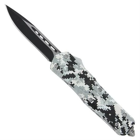 Delta Force D/A OTF Automatic Knife Arctic Camo Drop Point. A dual action mechanism allows you to deploy and retract the blade by using a thumb slide. The blade is made from stainless steel in a two tone drop point style. The handle has a digital Arctic camo finish. Made from zinc and held together with six Torx screws this knife is not just cool as hell but extremely durable. The butt features a glass breaker or punch just in case of emergencies. Another element is the pocket clip with the Badass knife logo. A nylon quick release sheath is provided to house your knife.Overall Length: 9 Inches.