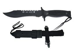 Blade is curved and has a serrated edge on the top. Blade slides easily into plastic sheath. Get yours today! 440 stainless steel 7 inch blade 12 inches overall