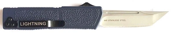 Lightning Model 2 Blue D/A OTF Automatic Knife Satin Tanto. Aerospace Grade Aircraft Aluminum Handle 440 Stainless Steel Blade Deep Carry Pocket Clip. 8 inch total length 3.25 inch blade. Strong spring dual action snap with the push of the button forward and backward
