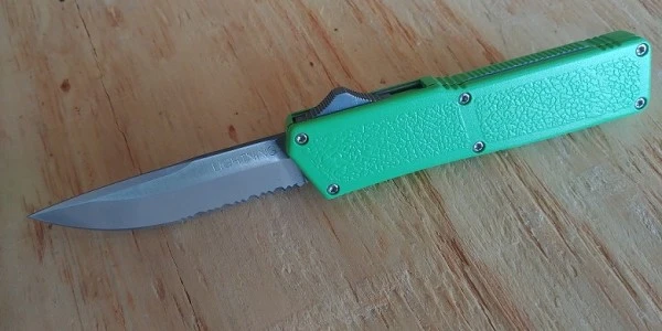 Lightning Zombie Green D/A OTF Automatic Knife Satin DP Serrated. 440 stainless steel 3.25 inch blade with a pocket clip on the side of the handle. 8 inches overall length with super spring action. This knife is made in taiwan.