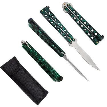 Martial Arts Thick Heavy Marble Green Butterfly Knife. 9 inch overall length 440 stainless steel 4 inch drop point blade Dual sided flip encasement Thick 0.5 inch Green paint splatter handle Free Nylon Pouch