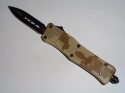 Mini Delta Force Desert Camo Automatic Knife Black Dagger. Overall Length: 6.5 Inches blade length of 2.50 inches 440 stainless steel with pocket clip, glass breaker and belt sheath.