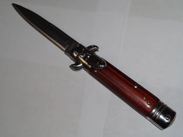 Rosewood Lever Lock Automatic Knife Bayo. 7.75″ overall length, 3.25 inch 440 stainless steel blade. Very well built with great spring action and belt sheath.