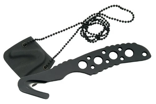This Seat Belt Cutter/Guthook Neck Knife by Szco Supplies is 6.5 Inch in overall length. The black finish knife is made of stainless steel. This neck knife comes with a hard plastic sheath and a chain.