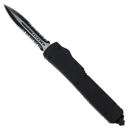 Storm Trooper Black D/A OTF Automatic Knife Black Dagger Serrated. It comes with removable pocket clip, glass breaker and a nylon pouch. Overall Length: 8.25 Inches, Blade Length: 3.25 Inches