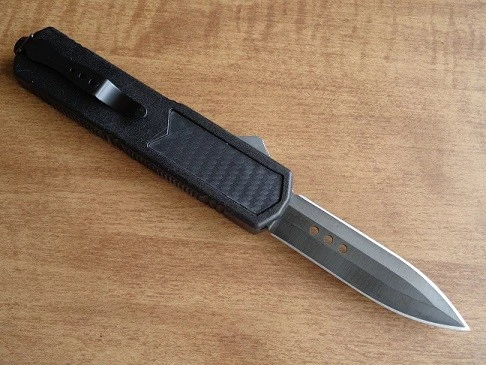 Titan Black Carbon Grip D/A OTF Automatic Knife Black Dagger. 440 stainless steel 3.25 inch blade with a pocket clip on the side of the handle. 8.5 inches overall length. Strong spring action with a push of the button you can hear the blade snap into position. It has a glass breaker on the end of the handle. The handle has scruffy grip inserts and the push button is on the spine. The blade pops in and out with a flick of the button. This knife was made in taiwan.